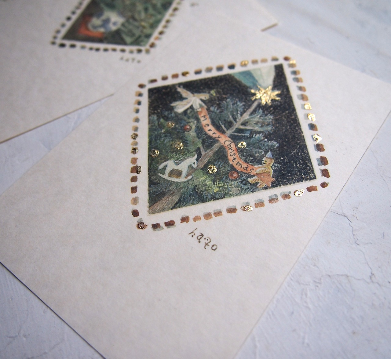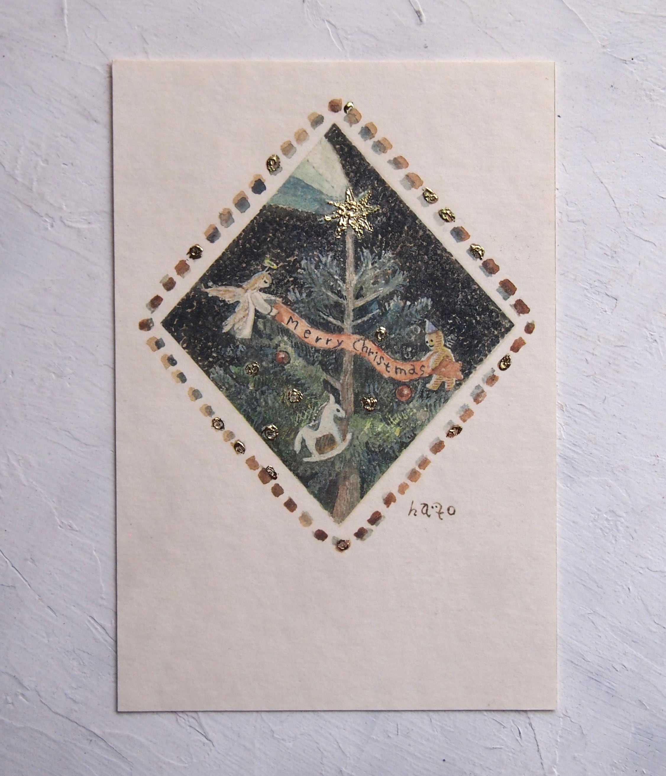 クリスマスツリーと天使やジンジャーマン達のポストカードです。