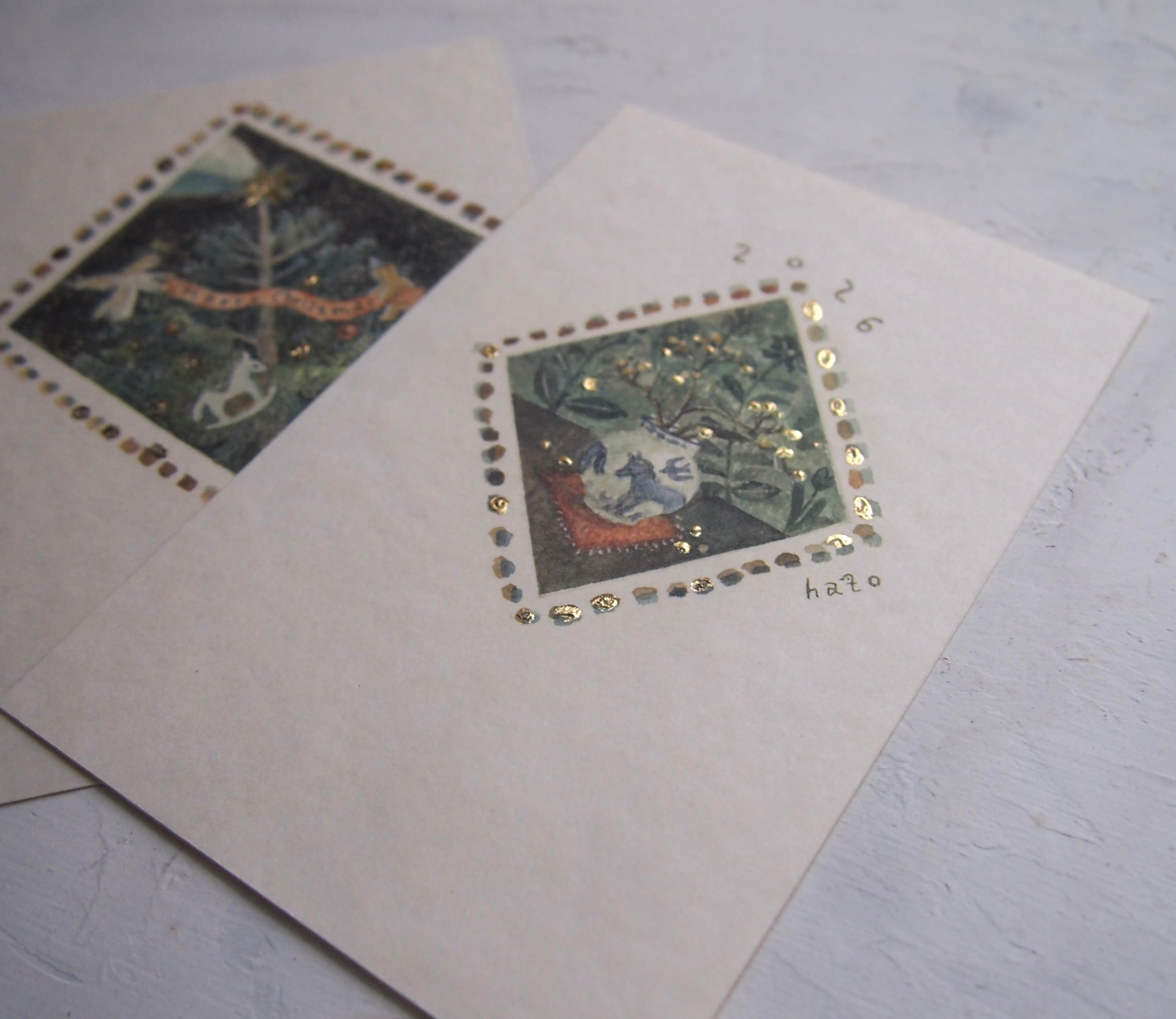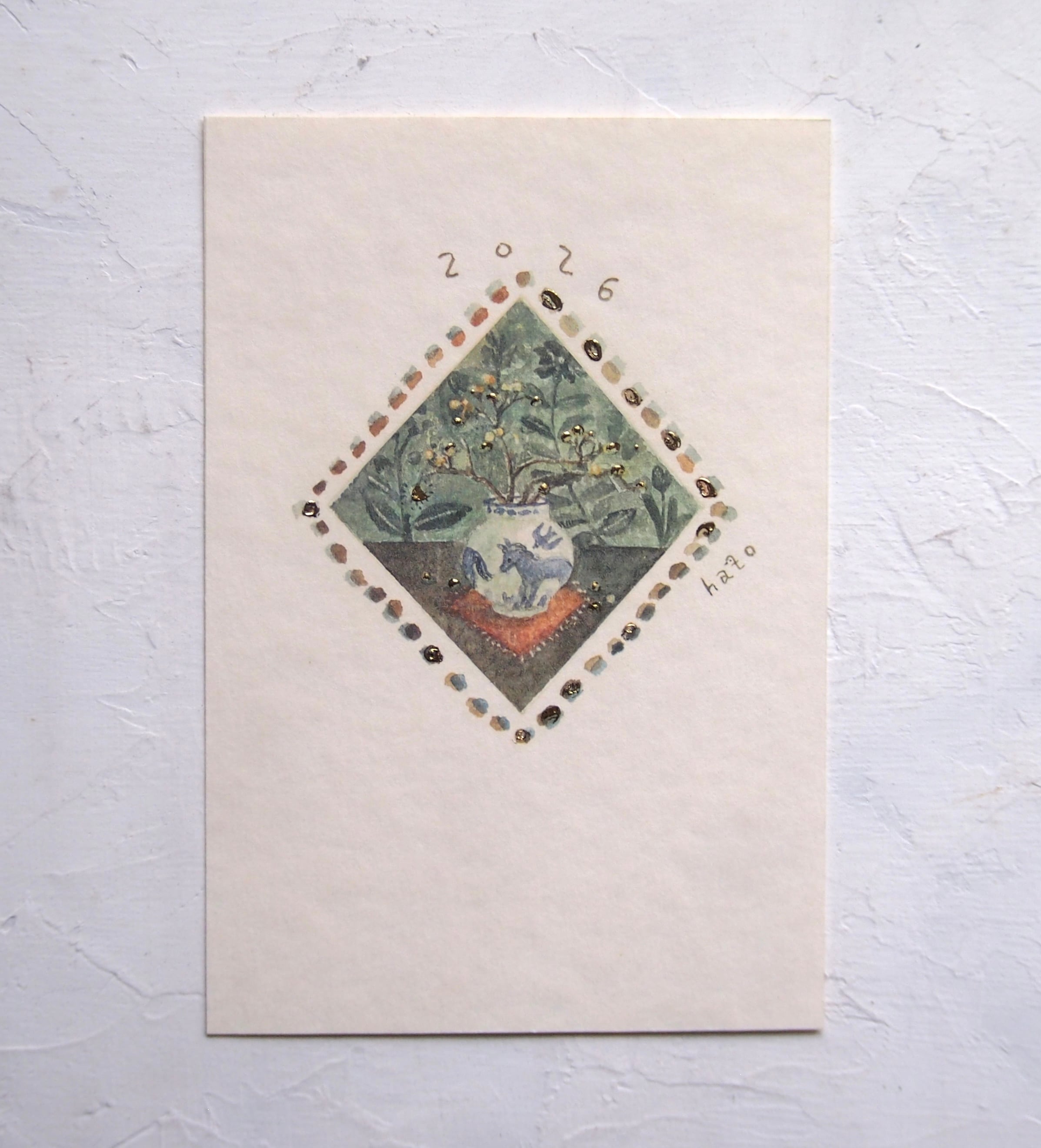 新年をテーマにした馬の模様の花瓶と南天の木のポストカードです。