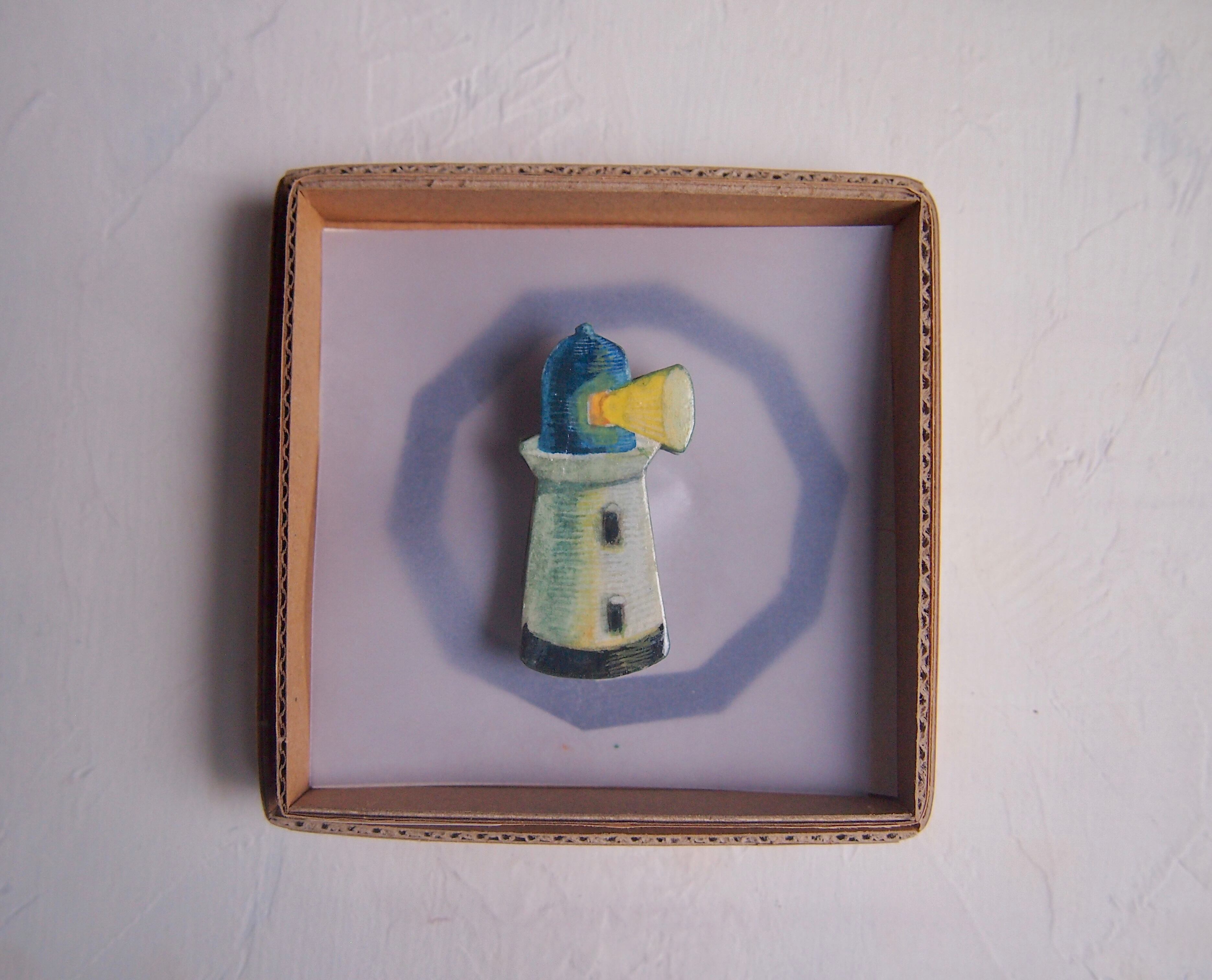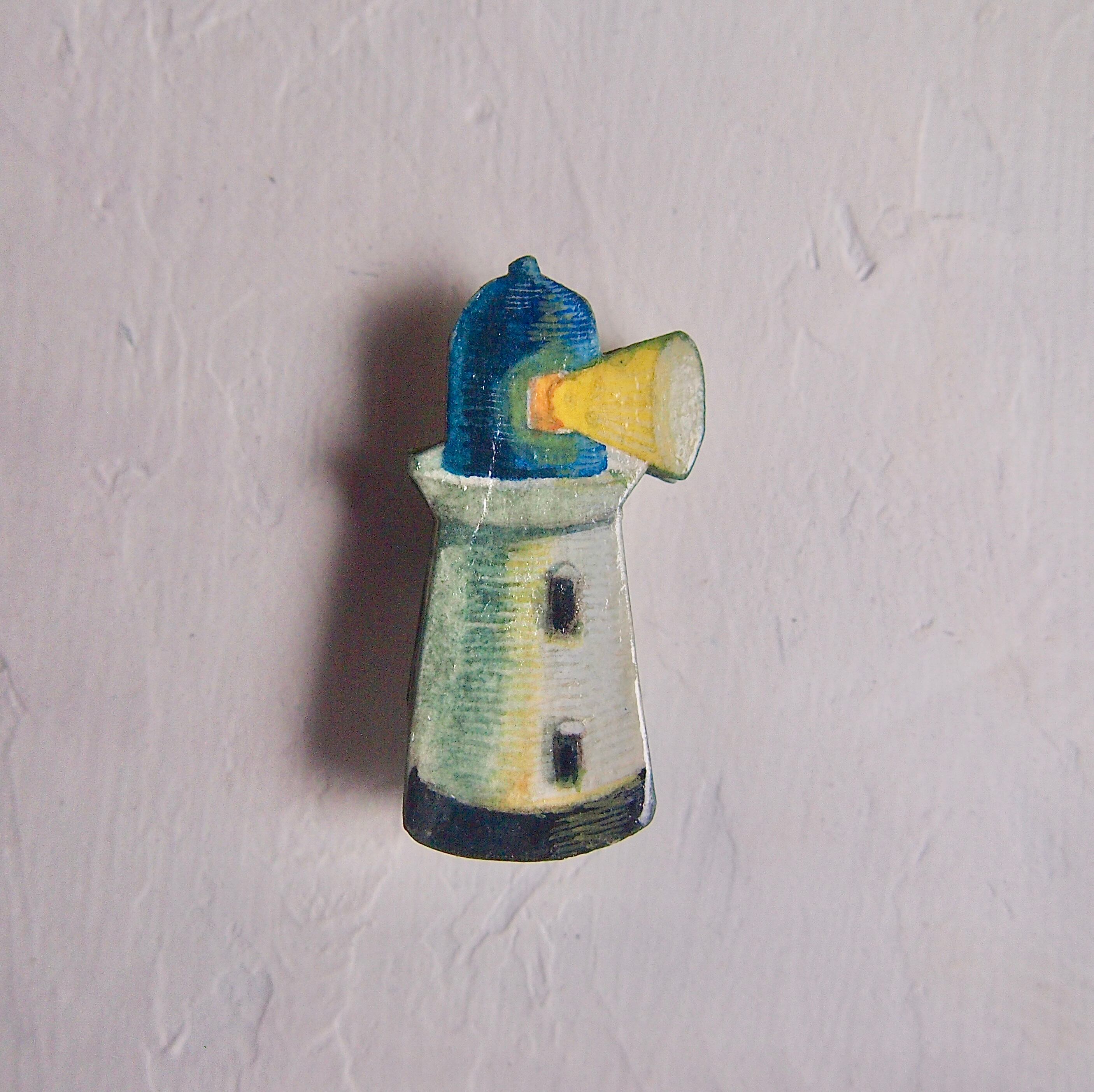 紙に絵を描き、裏に木材を貼り付けてブローチにしています。
